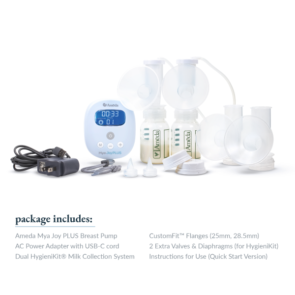 Meet the Ameda Mya Joy PLUS – the newest member of the Mya Joy family of pumping solutions. Mya Joy PLUS combines the hospital strength performance moms demand with the incredibly small pump design they need. The thoughtfully designed pump comfortably fits in the palm of your hand and has whisper quiet operation. We "PLUSED" up the new Mya Joy PLUS with additional lifestyle features that include a long-lasting rechargeable battery, USB charging cord and convenient wrist lanyard. All of this from Ameda – the brand Trusted by Hospitals and Loved by Moms for over 80 years.